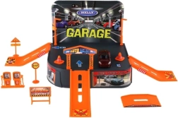 Ce jeu inclut un garage pliable, une pompe à essence, et des rampes, tous conçus pour un jeu créatif et pour favoriser l'imagination des enfants. Le garage est également équipé de panneaux et l'ensemble inclut des autocollants pour la décoration personnelle.