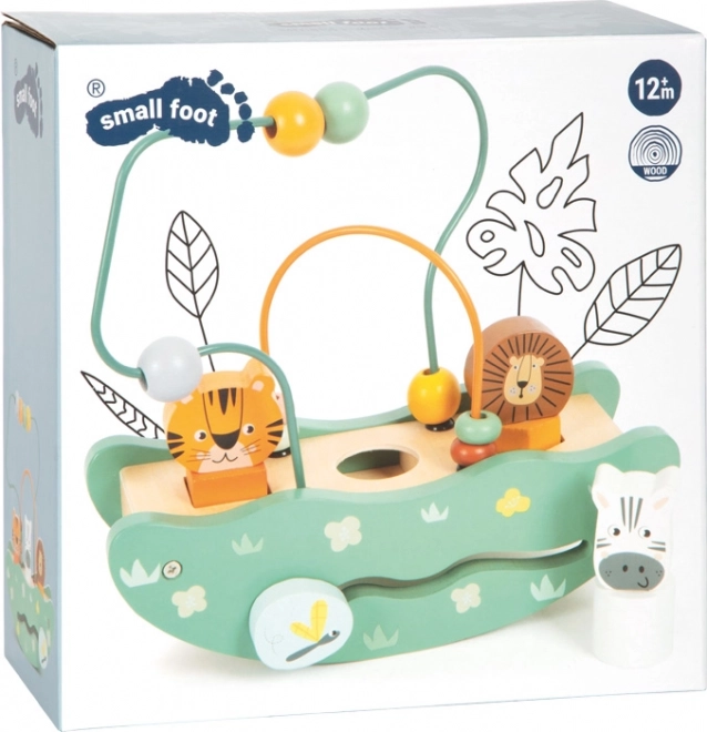 Le jouet en bois sur le thème du safari comprend des perles colorées et des figurines de lion, tigre et zèbre pour un apprentissage ludique.