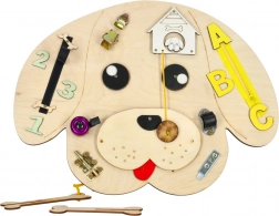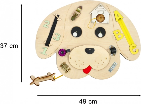 Cette adorable planche d’activités en forme de tête de chien est conçue pour des découvertes sûres et un entraînement quotidien des compétences. Les enfants exercent la prise, la coordination œil-main et la patience en manipulant différents fermoirs, une fermeture éclair ou la clochette. Les lettres et chiffres colorés favorisent en outre naturellement les premiers apprentissages de l’alphabet et du calcul.