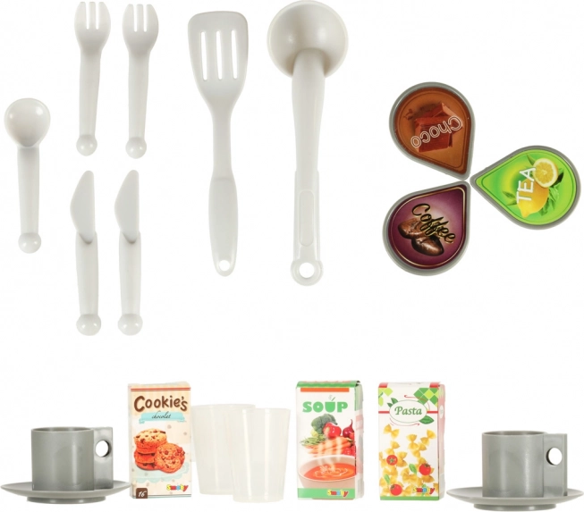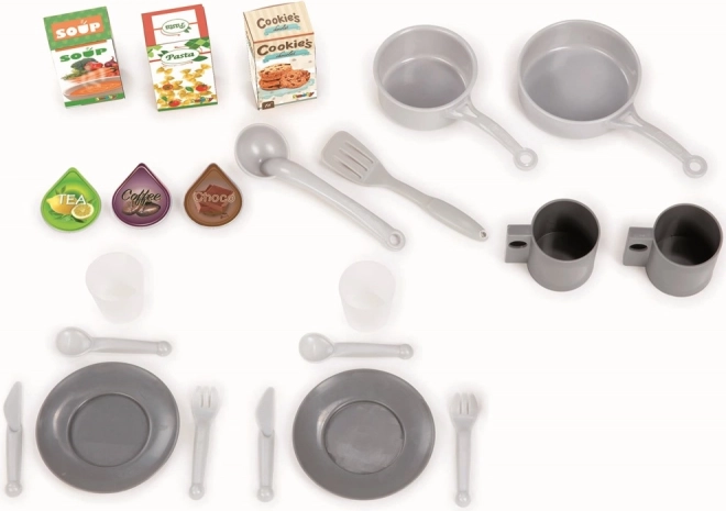 - Cuisine + env. 22–23 pcs d’accessoires (2 casseroles, 2 assiettes, couverts, 2 tasses, 2 verres, capsules, ustensiles de cuisine, aliments, etc.)