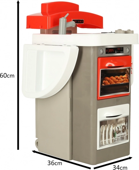 La cuisine comprend un évier avec robinet, un four, un lave-vaisselle, un réfrigérateur avec portes ouvrantes et une machine à café à capsules avec espace de rangement. Inclus 22–23 pièces d’accessoires (casseroles, assiettes, couverts, tasses, verres, capsules, ustensiles de cuisine, aliments). Grâce aux roulettes et à la structure pliable ingénieuse, vous la déplacez et la rangez facilement après le jeu.