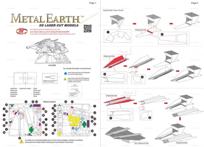 Retirez les différentes pièces des plaques métalliques, en utilisant si nécessaire de petites pinces coupantes (non incluses). Les pièces s’assemblent grâce à des verrous constitués d’un ergot et d’un trou. Pliez l’ergot à l’aide de petites pinces fines (non incluses) et assemblez progressivement tous les verrous jusqu’à obtenir une pièce maîtresse très réaliste !