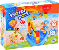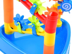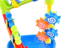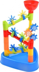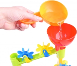 Versez l’eau directement dans l’entonnoir supérieur – le flux suivra les pistes et fera tourner tous les moulins colorés.