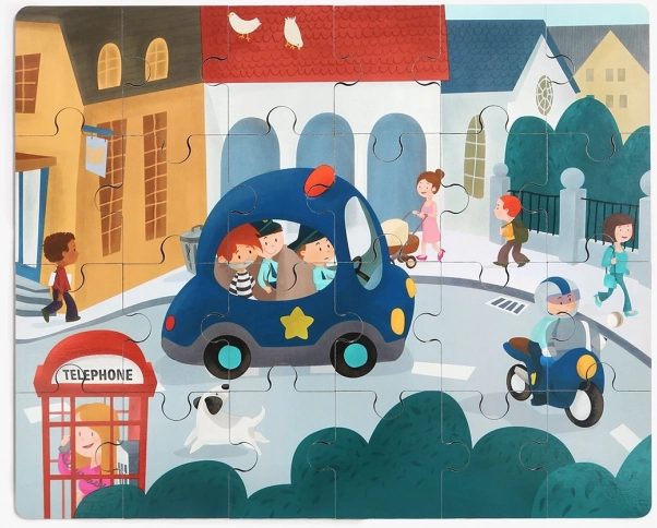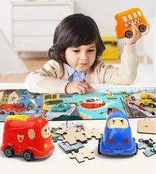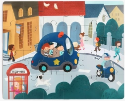 Procurez-vous aussi d'autres moyens de transport (camion de pompiers, bus scolaire, bulldozer, hélicoptère, bateau). Les pièces de bord se raccordent entre elles et vous obtenez un long puzzle panoramique ainsi qu'une collection de jouets roulants.