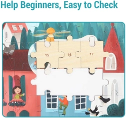 Chaque pièce en bois est numérotée au dos. Les enfants exercent leur logique, le calcul et la patience sans frustration inutile.