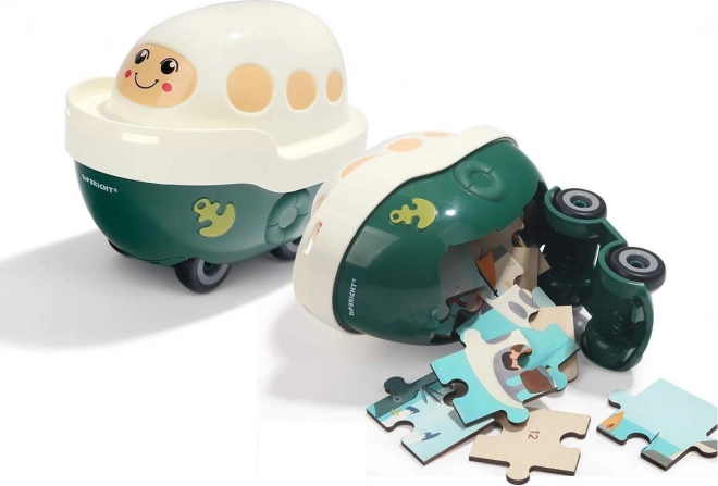Le petit bateau en plastique au visage adorable est un jouet pleinement fonctionnel. Le couvercle inférieur s’ouvre et peut contenir l’ensemble du puzzle ou d’autres petits trésors.