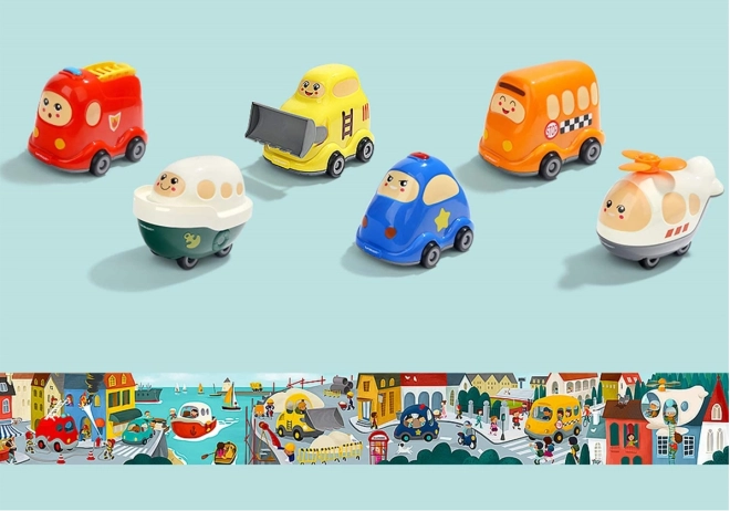 Avec d’autres modèles TOP BRIGHT (camion de pompiers, voiture de police, bus scolaire, bulldozer, hélicoptère), vous assemblez au sol un puzzle panoramique fluide.