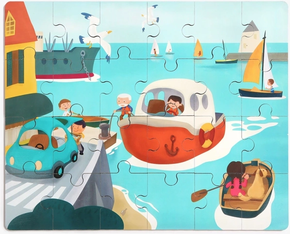 Ce 2-en-1 original associe le plaisir de jouer avec des véhicules et la joie d’assembler un puzzle. Le puzzle en bois sur le thème des transports favorise la concentration, la motricité fine et le développement de la logique. Le bateau est un jouet à roulettes à part entière et renferme un espace sûr pour ranger les pièces du puzzle ou les trésors des enfants.
