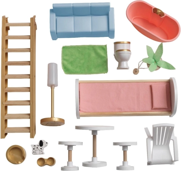 L’emballage comprend 15 pièces de mobilier et d’accessoires colorés, afin que les enfants puissent aménager chaque pièce selon leurs envies dès l’ouverture. La combinaison de bois et de plastiques durables garantit une longue durée de vie et un jeu en toute sécurité dès 3 ans.