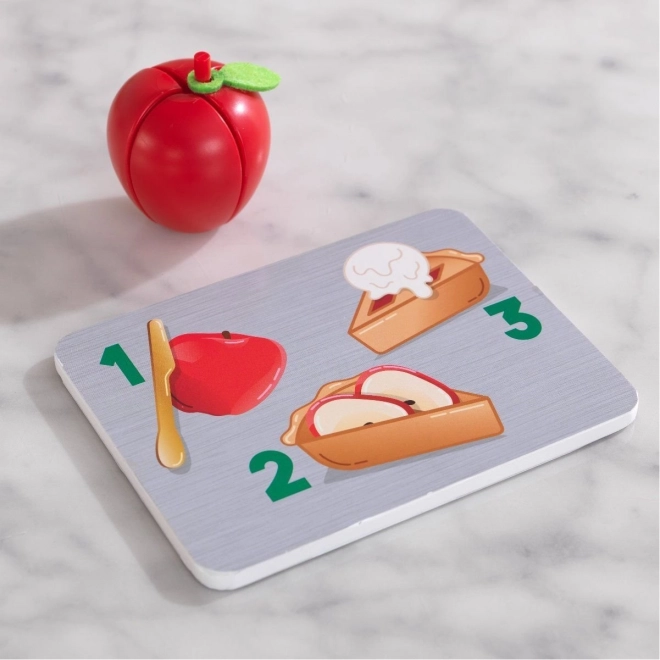 Ce kit de jeu créatif transforme la petite cuisine en une boulangerie chaleureuse. Les enfants suivent toutes les étapes de préparation – de la découpe des pommes à l’ajout des épices, jusqu’au montage de la tarte et son service. La carte-recette incluse, qui sert aussi de planche à découper, guide les petits pâtissiers pas à pas.