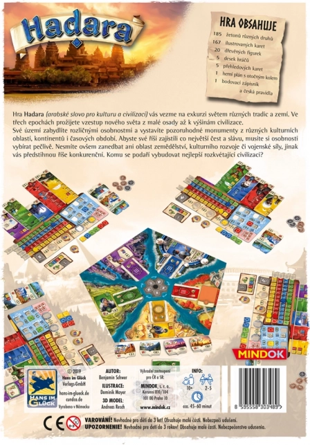 Partez à la rencontre des cultures et bâtissez votre propre civilisation au fil de trois époques. Dans la stratégie finement équilibrée Hadara, vous recrutez des personnalités, développez l’économie, la culture et la puissance militaire et, grâce à la roue rotative de sélection de cartes, composez un moteur efficace qui vous mènera à l’honneur, la gloire et aux points de victoire.