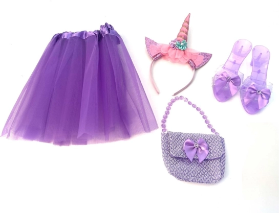 - Set 4 pièces : pantoufles, sac à main, jupe, serre-tête