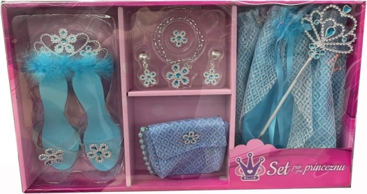 Réalisez le rêve de chaque petite princesse avec ce set de princesse en bleu. L’ensemble comprend une jupe, des mules, une couronne, un sac, une baguette et des bijoux – tout le nécessaire pour un jeu de princesse magique.