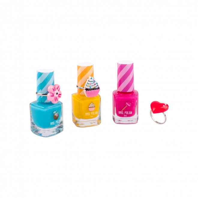 Chaque vernis est accompagné d’une bague assortie au thème (fleur, cœur, cupcake), à porter seule ou à coordonner avec la couleur choisie.