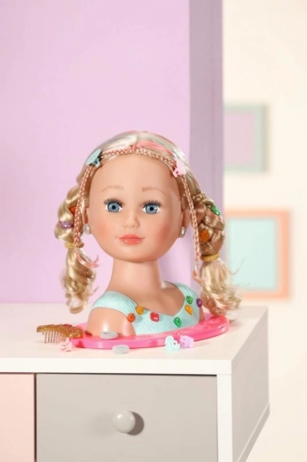 Transformez chaque après-midi en un salon de beauté féerique. La tête à coiffer BABY born sœur, avec ses cheveux blonds de qualité, se coiffe facilement en ondulations, tresses, queues de cheval ou chignons élégants. Grâce au riche ensemble d’accessoires et au maquillage sûr, les enfants créent une infinité de styles, du look princesse au plus moderne.