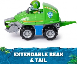 Découvrez le plaisir de jeu inspiré de la série PAT’ PATROUILLE. Le véhicule jungle de Rocky se transforme en appuyant sur l’avant : le bec de tortue se déploie, vous tirez la queue sur le côté et l’ouverture de la gueule achève le passage à l’action. Les enfants peuvent ainsi rejouer leurs scènes préférées et inventer de nouvelles aventures dans la jungle sauvage.