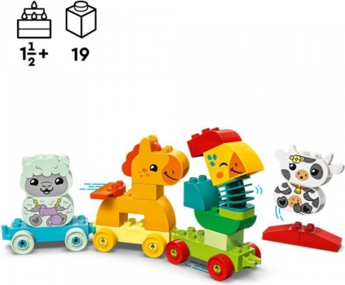 Le train des animaux LEGO DUPLO ravira tous les petits fans d’animaux et de véhicules. Les enfants construisent un coq, un cheval, un mouton et une vache, les installent dans des wagonnets assortis par couleur et partent pour une aventure. Grâce aux grosses briques, le set se monte facilement et favorise l’apprentissage par le jeu.