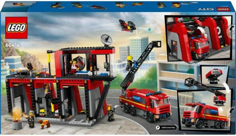 - Caserne de pompiers d’action – infrastructure moderne, aire d’atterrissage, barre de glisse pour minifigurines, cuisine et zones de repos.