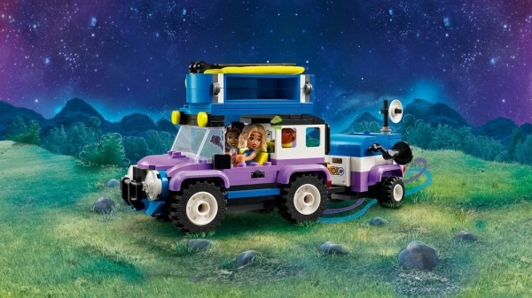Avec cet ensemble créatif, les enfants construisent un 4x4 avec remorque et tente pliable, assemblent un télescope et installent un campement sous le ciel étoilé. Un panneau décoré de planètes et d’étoiles permet de créer ses propres constellations que les personnages peuvent ensuite observer. L’ensemble allie amusement, apprentissage et histoires d’amitié.