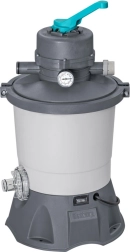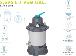 Grâce à sa capacité de 3596 l/h, la pompe est idéale pour des piscines d’un volume de 1 100 à 18 100 litres. Pour fonctionner, elle nécessite une charge de sable (sable de quartz n°20, granulométrie 0,45–0,85 mm, environ 8,5 kg) ou des billes filtrantes haute performance Polysphere™ d’environ 240 g.