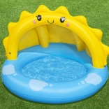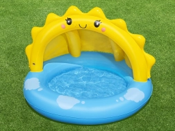 La piscine se vante d'un design joyeux avec un soleil jaune et un fond bleu avec des nuages qui captivera chaque enfant.