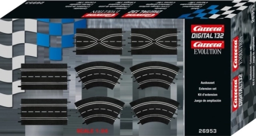 Kit d’extension pour circuits Evolution, Digital 132 et Digital 124. 2 lignes droites, 2 croisements, 4 virages 1/60°, pinces. Au total 2,8 m de plaisir.