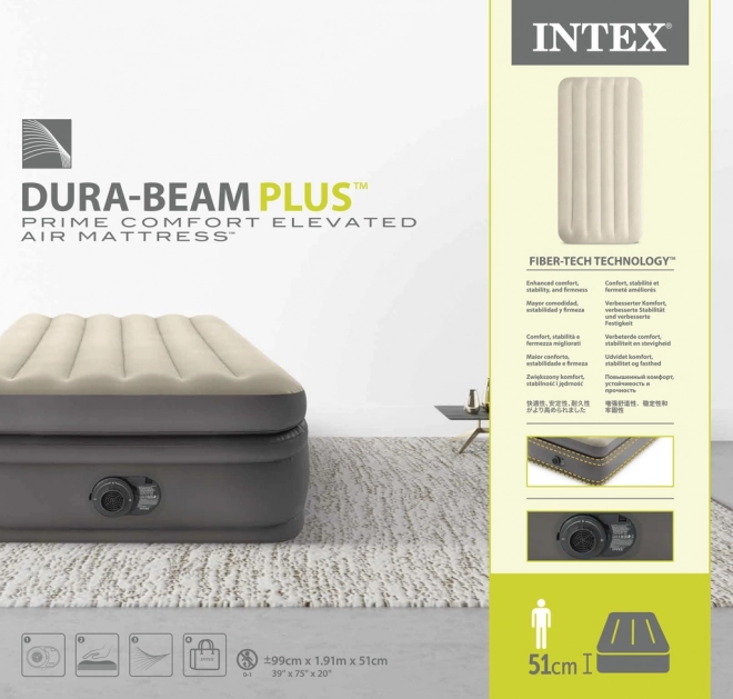 Le matelas gonflable à double hauteur de 51 cm facilite l’installation et le lever, offrant la sensation d’un vrai lit. Le vinyle résistant avec surface floquée douce est agréable au toucher et facile à entretenir. La structure interne Dura‑Beam à fibres garantit un soutien homogène du corps et une stabilité durable sans effet de balancement.