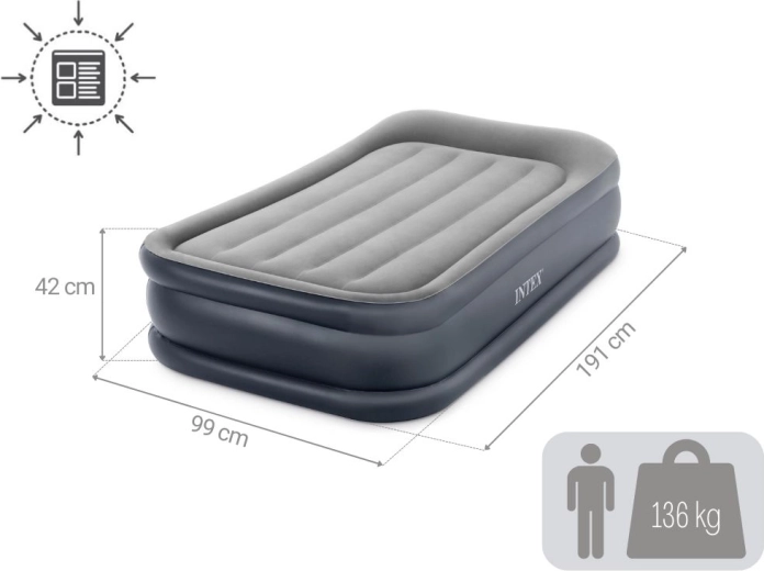 Vous cherchez un couchage d’appoint confortable et stable pour des invités, le chalet ou les voyages ? Le lit gonflable une place INTEX d’une hauteur de 42 cm offre un confort comparable à un lit classique. La surface en velours est agréable au toucher et empêche le drap de glisser, tandis que la pompe électrique intégrée (220–240 V) assure une préparation rapide pour dormir.