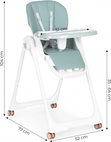 Le double plateau avec bords surélevés et porte‑gobelet limite le désordre et la couche supérieure se retire facilement après le repas pour être lavée. Le revêtement en éco‑cuir se nettoie d’un simple coup de chiffon humide. Les roulettes avec bande de roulement en caoutchouc facilitent les déplacements sans rayer le sol et les verrous intégrés maintiennent la chaise solidement en place.