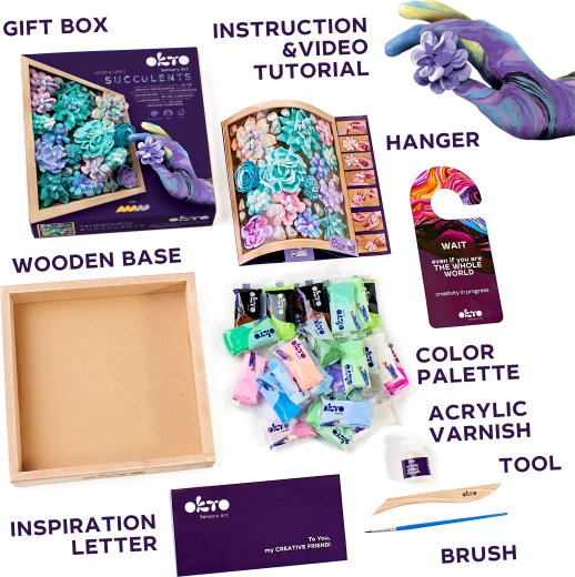 Kit créatif pour les passionnés de DIY comme pour les débutants. Créez des succulentes réalistes en pâte autodurcissante et exposez-les dans un élégant cadre en bois 21 × 21 cm. Le coffret contient tout le nécessaire – pâte, outil de modelage, pinceau et guide illustré – il suffit d’ouvrir et de se lancer.