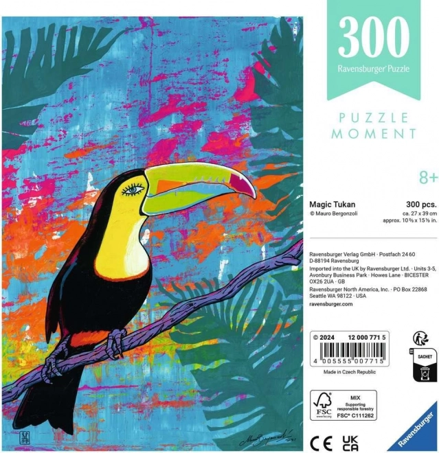 Profitez d’un moment de calme avec un puzzle de qualité signé RAVENSBURGER. La série Moment offre un assemblage relaxant avec un motif de toucan magique et 300 pièces découpées avec précision pour un défi agréable. Les pièces s’emboîtent parfaitement, présentent une surface mate et l’image finale de 27 × 39 cm ravira tous les amateurs de motifs animaliers.