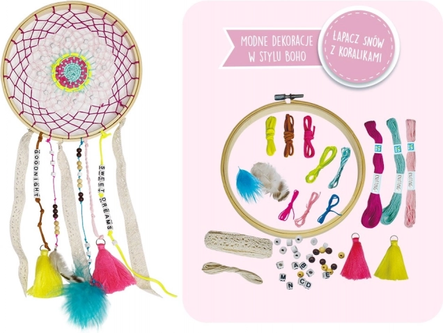 Créez votre propre capteur de rêves boho et stimulez votre imagination. Cet accessoire stylé se distingue aussi bien sur un mur qu’à la fenêtre et, grâce à 84 perles lettres, vous l’ornerez de inscriptions originales. Le coffret contient tout le nécessaire pour une création facile et une décoration personnalisée de la chambre d’enfant comme de la chambre à coucher.