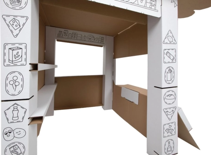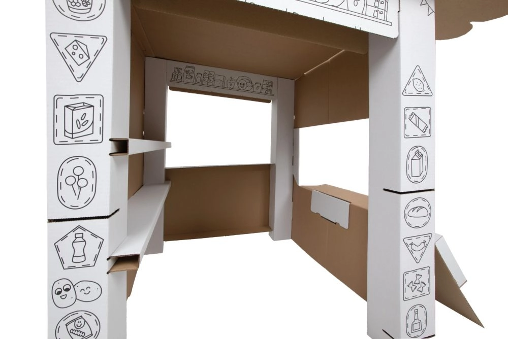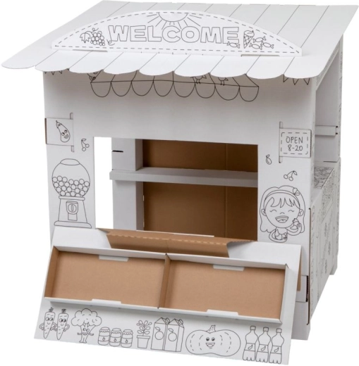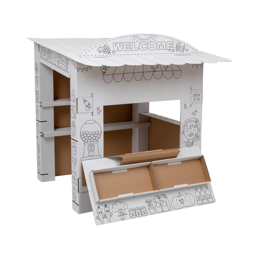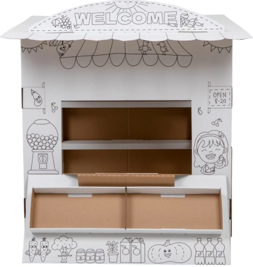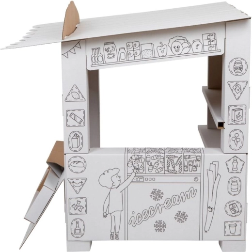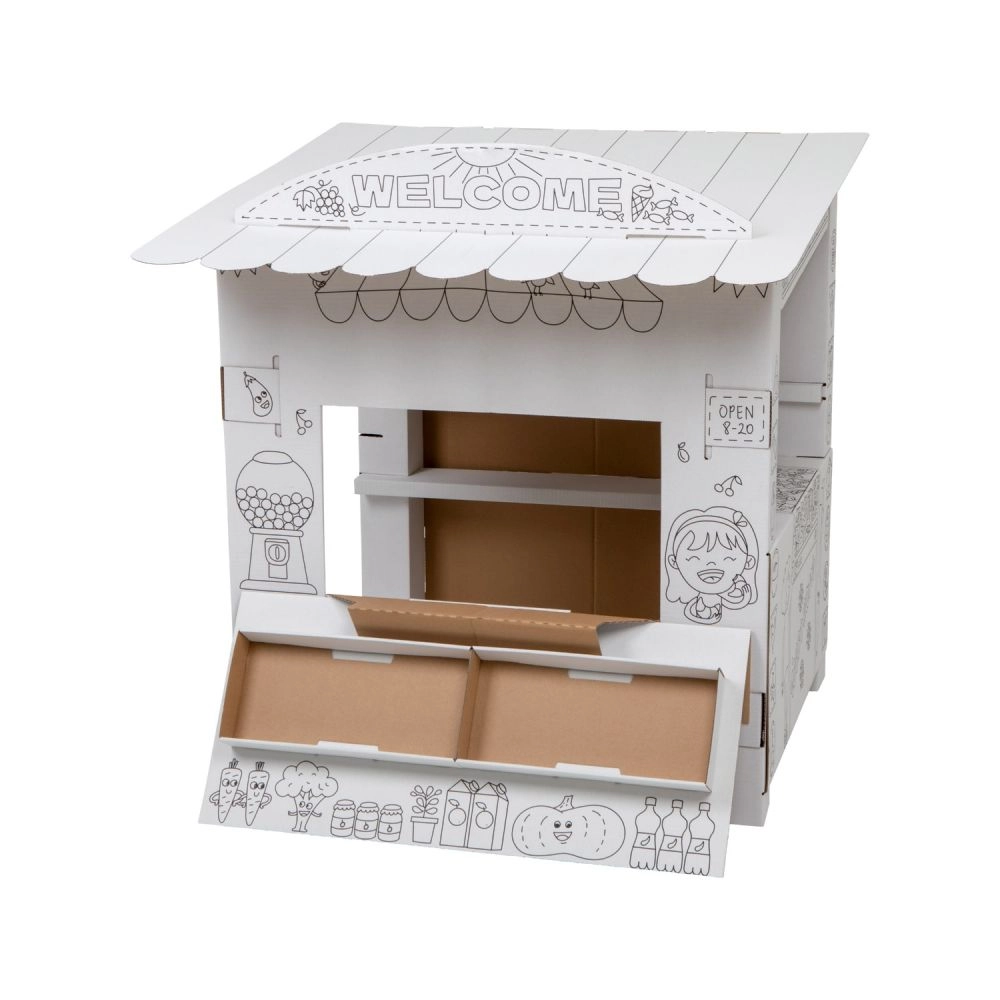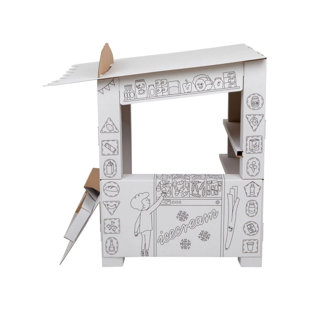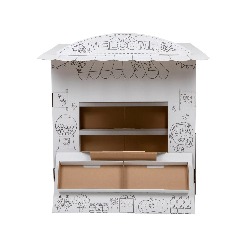 Ce stand en carton offre aux enfants beaucoup de plaisir et d’apprentissage en un seul produit. Grâce aux contours en noir et blanc, les enfants peuvent colorier avec des crayons, des feutres ou des crayons de cire et créer ainsi leur propre stand de vente original. Le design ouvert avec comptoir rabattable et étagères intérieures est parfait pour jouer au vendeur et au client.