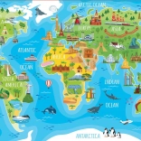 Puzzle géographique idéal pour les enfants, avec une carte du monde et de superbes illustrations de monuments célèbres. Découvrez des sites comme la tour Eiffel, les pyramides ou la statue de la Liberté.