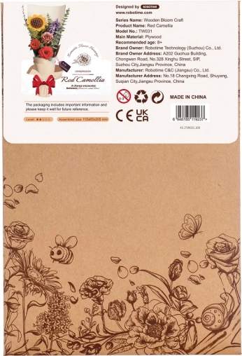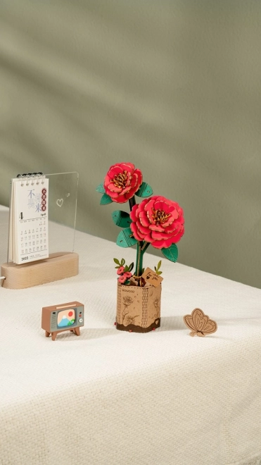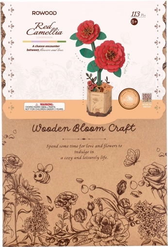 Ce puzzle 3D en bois élégant crée un modèle détaillé de camélia rouge dans un pot. Les pièces en bois de qualité, écologique, s’emboîtent avec précision et, une fois terminé, le modèle fera une excellente décoration stylée pour une table, une étagère ou un bureau.