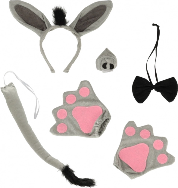 Ce costume est livré avec plusieurs accessoires, y compris un bandeau avec oreilles, des gants, un nez, une queue, et un nœud papillon.