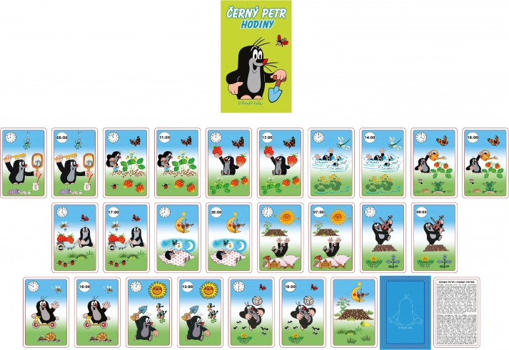 Jeu de cartes populaire Černý Petr avec le motif de la PETITE TAUPE en version éducative horloge qui développe l’orientation dans le temps de façon ludique. L’emballage contient 31 cartes et un mode d’emploi au format compact, idéal pour les voyages.