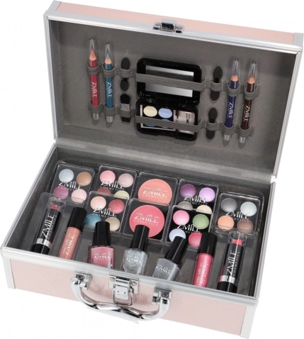 Trousse de maquillage rose « Eye-Catcher » avec miroir intégré – 42 pièces d’accessoires au total. Contient 24× fards à paupières, 2× vernis à ongles, 1× vernis pailleté, 1× blush, 2× rouges à lèvres, 2× gloss, 3× crayons pour les yeux, 1× khôl, 3× applicateurs double face, 1× pinceau. Testé dermatologiquement, conforme aux normes strictes de l’UE.