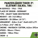 Ce set COBI de haute précision reproduit fidèlement le légendaire chasseur de chars lourd Elefant, conçu sur le châssis du Tiger (P). La boîte comprend de nombreux détails intérieurs, des trappes ouvrantes et une plaque nominative du véhicule. Tous les éléments graphiques sont imprimés – sans autocollants – pour un rendu durable et une valeur de collection.