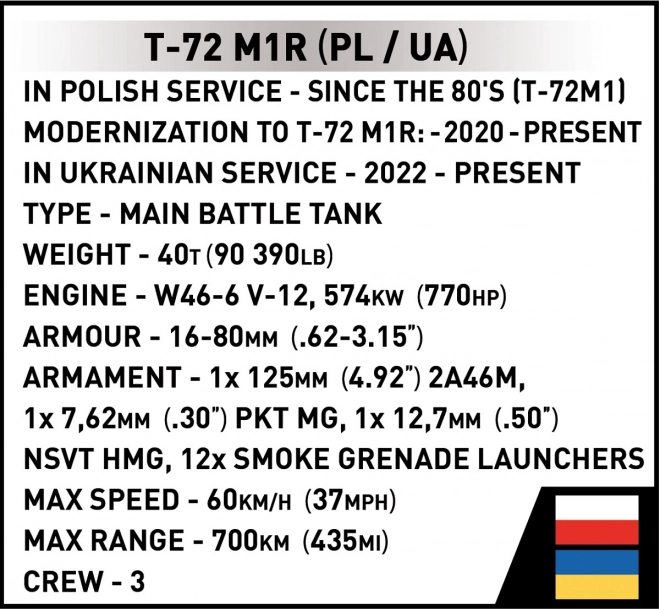 Le kit COBI reproduit fidèlement le char modernisé T-72M1R utilisé en Pologne et en Ukraine. À l’échelle 1:35, il s’accorde parfaitement avec les autres modèles de la série Armed Forces. Grâce à une nouvelle pièce spéciale pour les caractéristiques roues de roulement, à la tourelle rotative, au canon mobile et aux chenilles fonctionnelles, vous apprécierez autant la construction que le jeu et l’exposition.