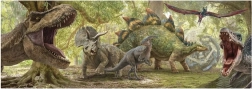 Ce puzzle présente des illustrations détaillées de dinosaures variés, du Tyrannosaure au Tricératops, dans leur environnement naturel.
