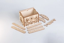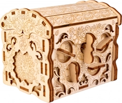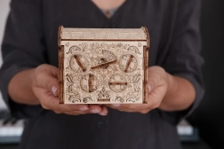 Des pièces découpées avec précision s’emboîtent parfaitement et dissimulent des mécanismes intelligemment conçus pour ranger de petits objets en toute sécurité.