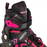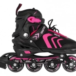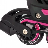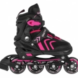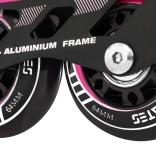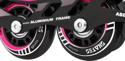Le confort est assuré par une semelle intérieure profilée en mousse EVA recouverte d’un matériau doux type Velvet. Le triple système de fermeture – lacets, sangle velcro et boucle de sécurité – maintient le pied fermement et de manière fiable. Le châssis en aluminium pour les roues, les roues PU 64×24 mm de dureté 85A et les roulements ABEC 7 offrent une glisse douce et stable. Les lames de patin en acier inoxydable sont faciles à entretenir et procurent une excellente glisse.