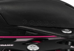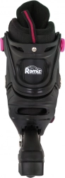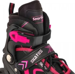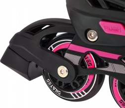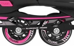 Le châssis en aluminium avec roues PU 70 × 24 mm, dureté 85A et roulements ABEC‑7 assure une glisse fluide et une bonne maniabilité. Les lames de acier inoxydable offrent de la sécurité sur la glace. La fermeture à trois points – laçage, bande velcro et boucle avec sécurité – maintient le pied fermement en place ; le patin droit est équipé d’un frein.