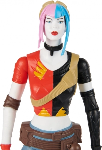 Costume noir et rouge contrasté, cheveux multicolores et accessoires détaillés reflètent fidèlement le style de Harley Quinn de l’univers DC.