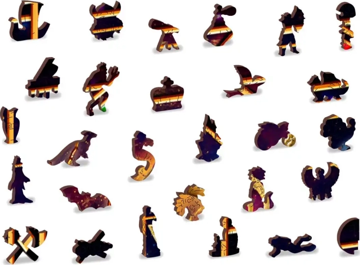 Les puzzles en bois WOODEN CITY découpés au laser, avec leurs pièces de forme spéciale, sont incroyablement divertissants. Une partie des pièces a la forme d’animaux, de bâtiments ou d’objets, dont l’effet final est renforcé par des détails accentués au laser. Ces pièces peuvent tenir seules comme de petites figurines. L’assemblage d’un puzzle aux pièces de formes variées est plus difficile et représente un plus grand défi que celui d’un puzzle classique. De plus, le puzzle est réversible : vous pouvez l’assembler soit selon l’image (face), soit selon les formes (dos avec motif).
