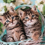 Deux chatons dans un panier en osier avec des fleurs créent une image chaleureuse et attrayante que les enfants aimeront terminer et exposer.