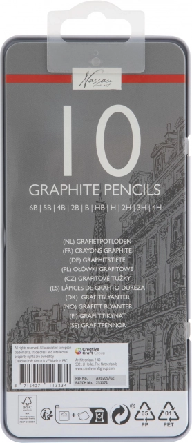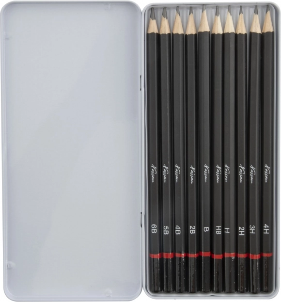 Le set de 10 crayons graphite couvre toute la plage utile pour la création : des tendres pour des ombres intenses et des traits expressifs aux durs pour des détails fins et des traits techniques. L’étui métallique fourni protège les crayons lors du transport et maintient l’ordre à l’atelier comme à l’école.