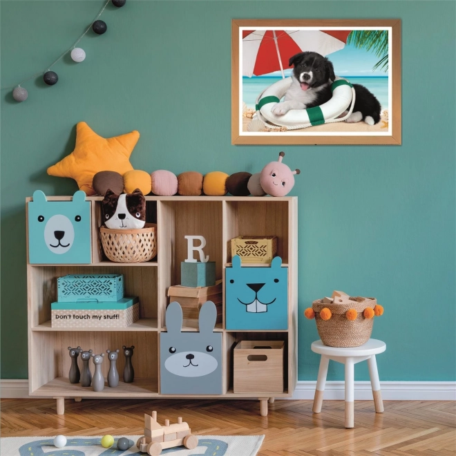 Un chiot adorable sur une bouée de sauvetage crée une atmosphère de vacances et ravira les petits amoureux des animaux.