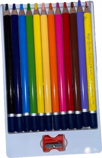 Longueur du crayon : 17,5 cm. L’emballage contient : 12 crayons (11 unicolores et 1 multicolore) et un taille-crayon.